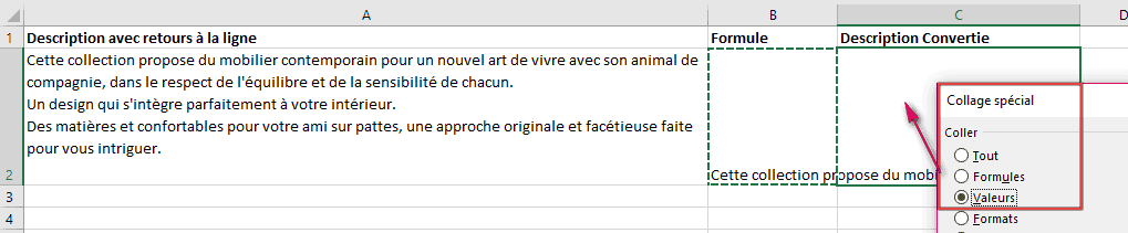 In cell C2 right-click to choose Paste Special > Values