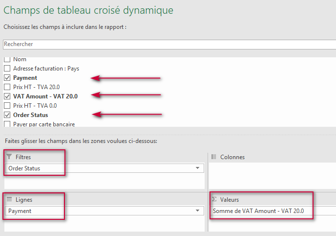 In this example, we will create a pivot table to show VAT totals by payment method, with the option to filter by order status.