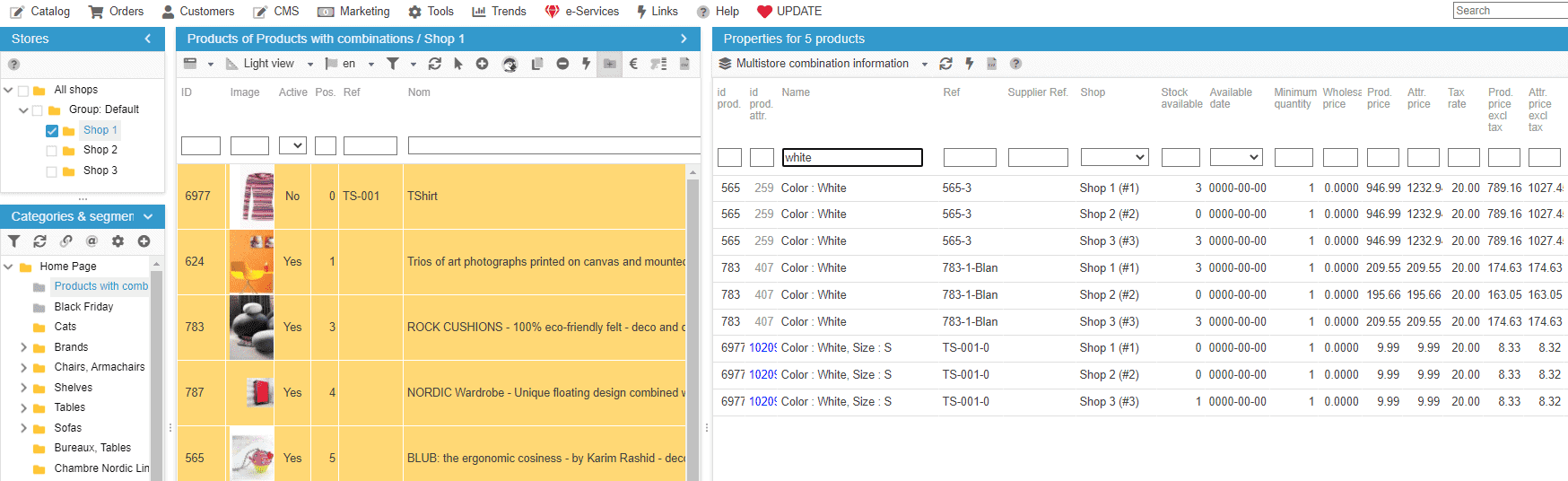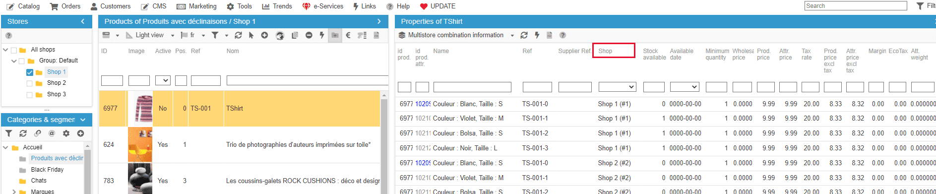 In this panel, you can visualize all combinations of a selected product in all stores they exist in, and differenciate them thanks to the 'Shop' column.