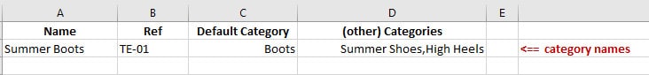In your CSV file, you can use category names (case sensitive), but also category IDs - both options are available in the import mapping - see examples below.