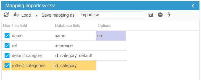 Because a product can be present in multiple categories, one of them being the default category (SEO), there are 2 fields available when importing: