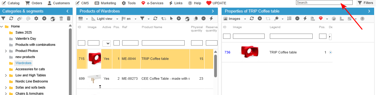 A link to the found product will be displayed in the box, and all you need to do is click on it to display the product in its default category.