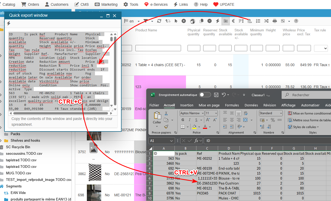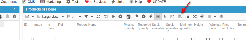 It can also be used to get the current product information on a spreadsheet in order to modify it, and then apply the modifications by importing the file (once saved as a CSV file).