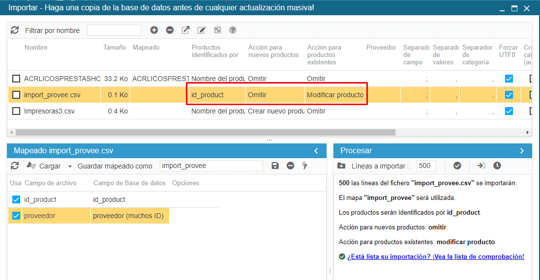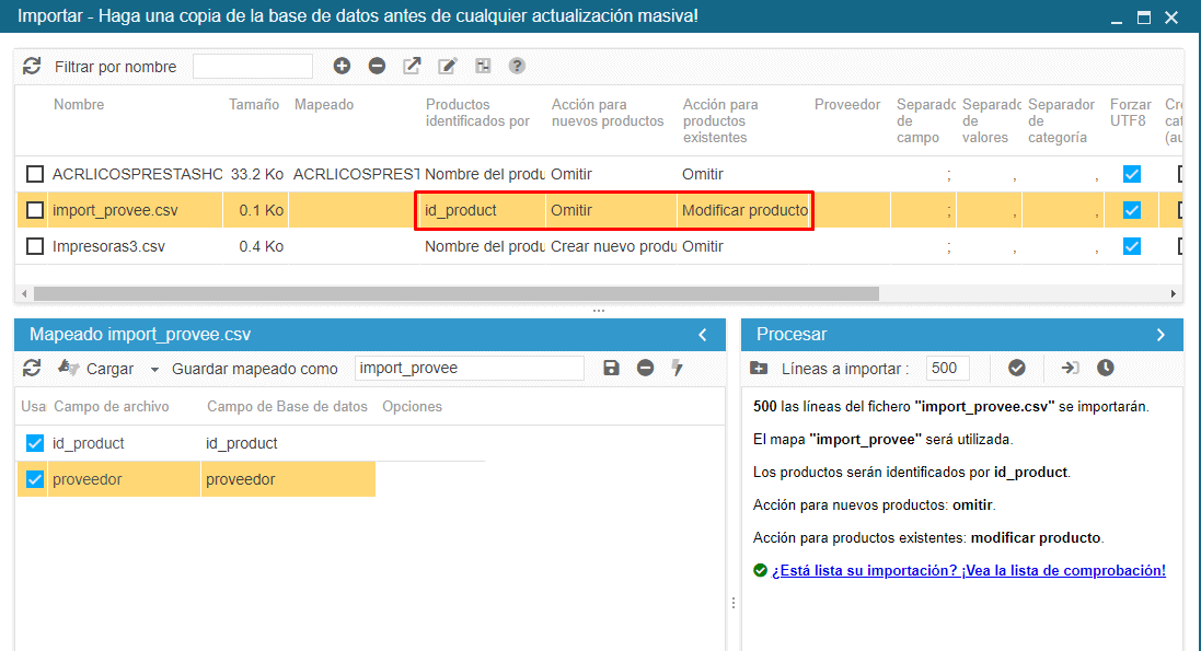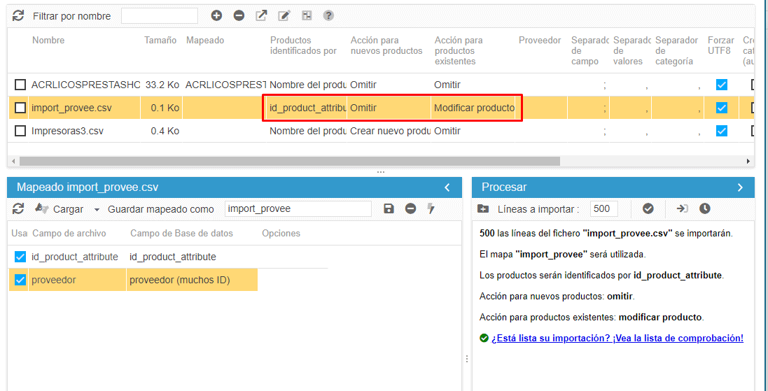 Los resultados de la importación se mostrarán en la tabla de proveedores en el panel de la derecha de la tabla de combinaciones.