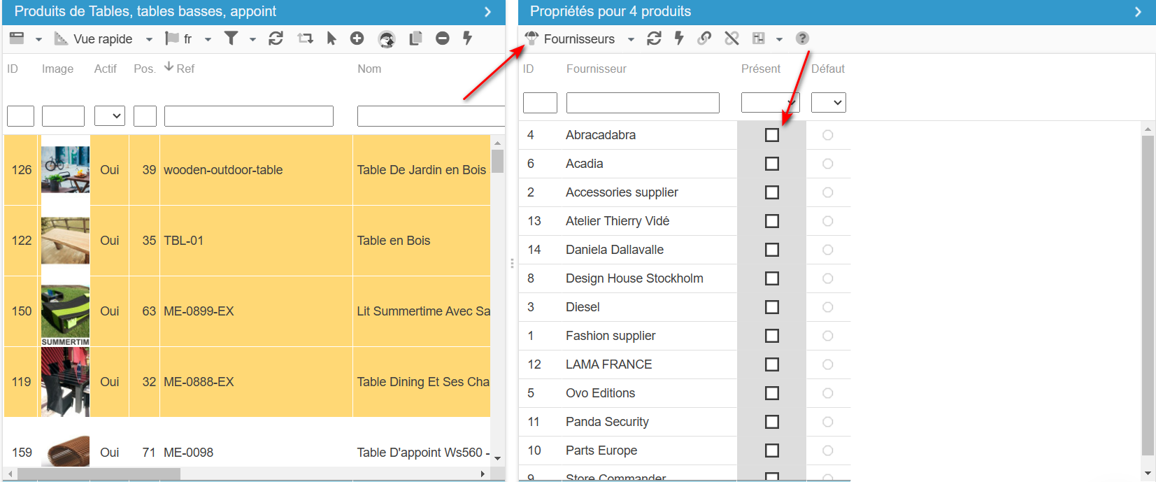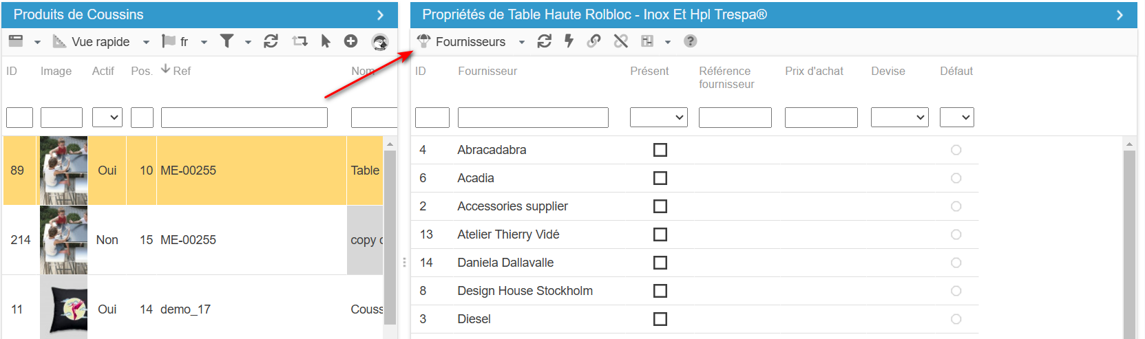 Store Commander le permite gestionar sus proveedores en masa en la interfaz, con su cuadrícula dedicada «Proveedores» accesible desde la columna Propiedades de la derecha.