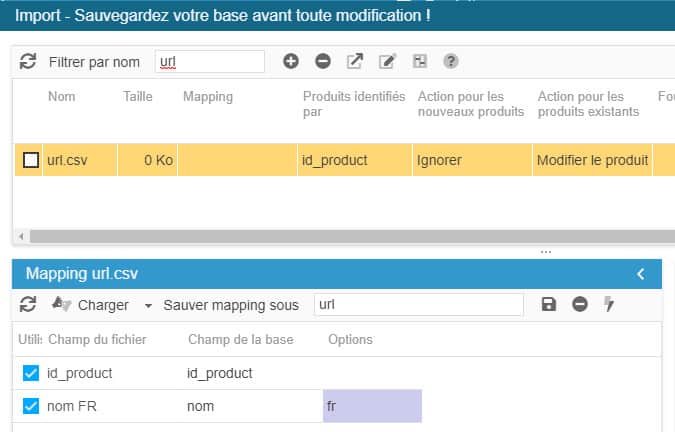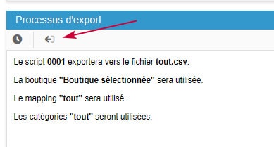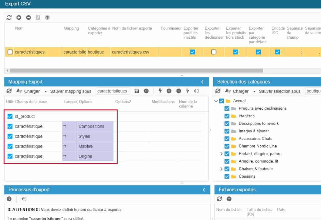 4. Al volver al panel principal, en la línea de secuencia de comandos, seleccione la asignación y las categorías en las columnas correspondientes. Ingrese el nombre del archivo a exportar, aquí stockproduits.csv.