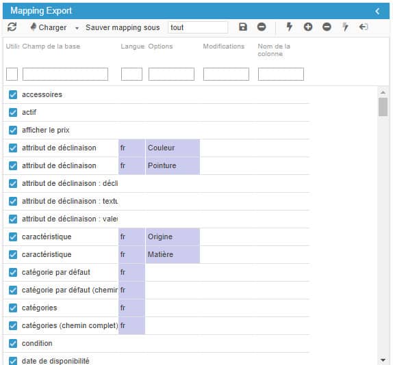 Store Commander le permite exportar la totalidad de su catálogo en todas las lenguas con solo unas operaciones. Esto es posible con el icono de mapping que permite cambiar todos los campos utilizados en su catálogo, en todas las lenguas.