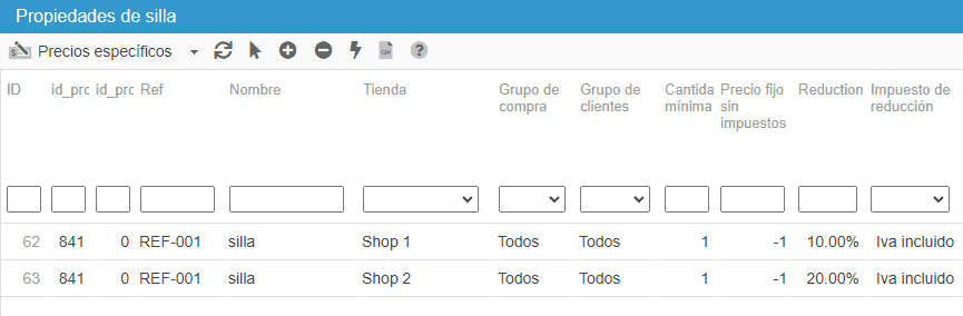 Aquí, suprimimos todos los precios especificos del producto ID 5072 en las tiendas id 1, 2 y 3, y luego, añadimos un nuevo precio especial (25€) en la tienda ID 1 únicamente.