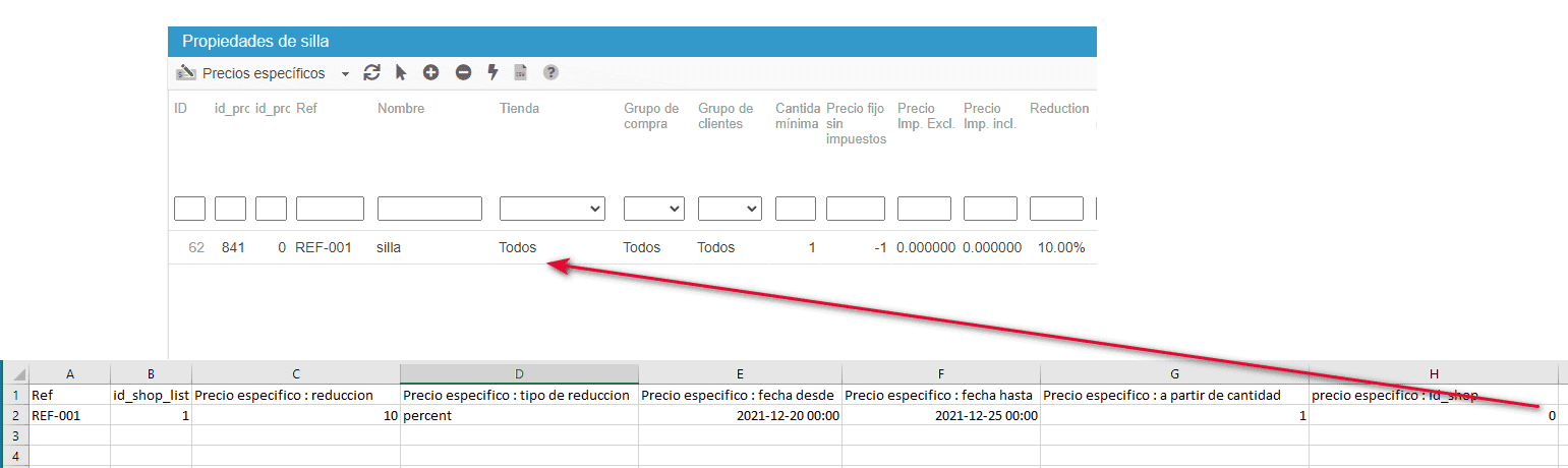 Si en la misma importación quiere incluir un nuevo precio especifico en una tienda específica, entonces deberá incluir el campo "precio especial": id_shop'.