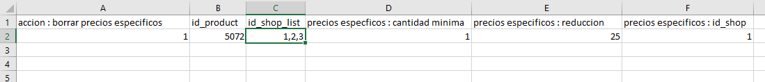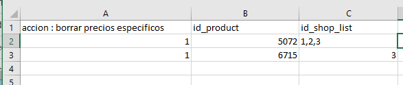 En la importación, para suprimir los precios especificos de un producto en tiendas específicas, puede indicar los id de las tiendas en el campo 'id_shop_list'.En este ejemplo, suprimimos todos los precios especificos del producto ID 5072 en las tiendas id 1, 2 y 3, y en el producto ID 6715 únicamente en la tienda ID 3