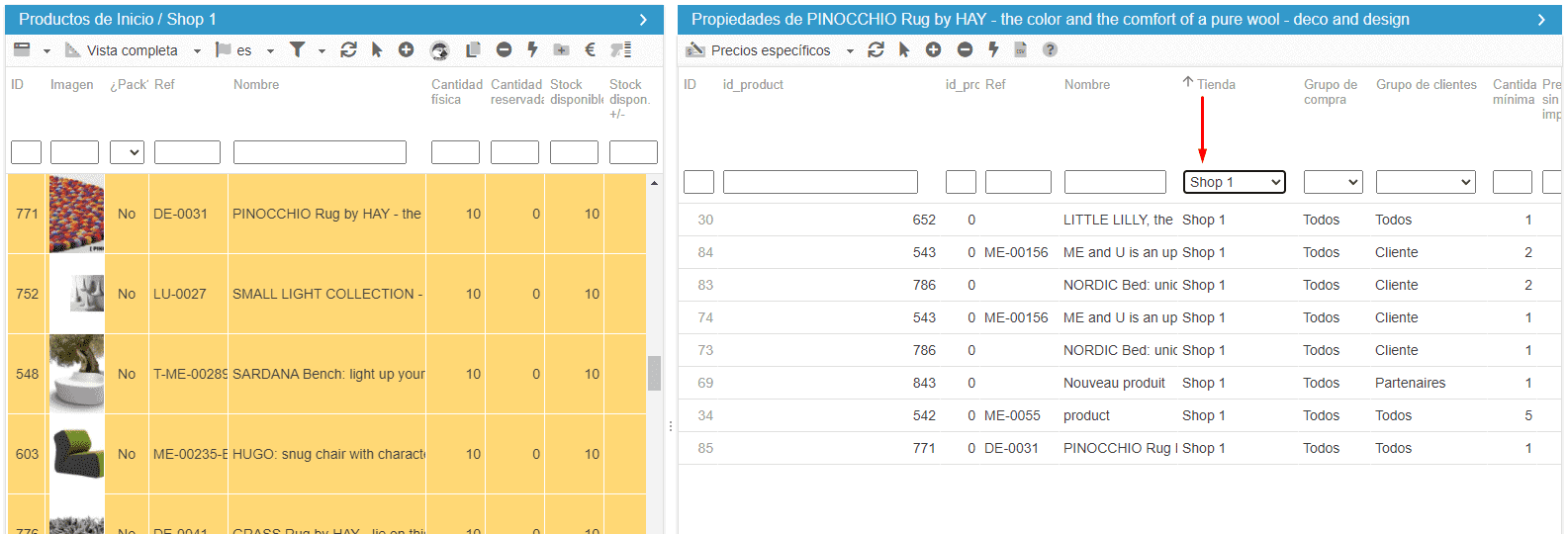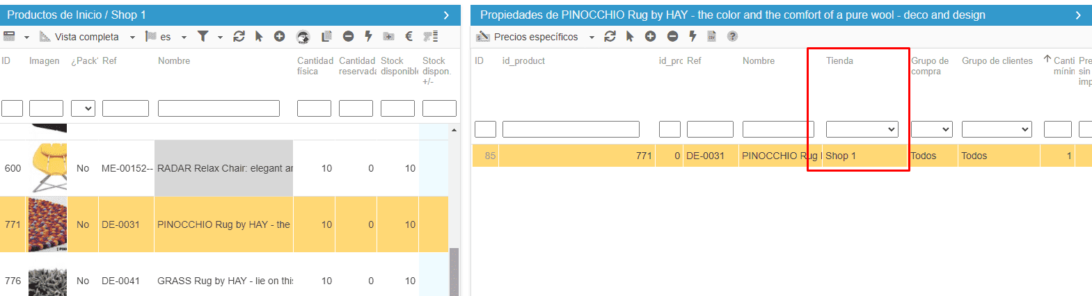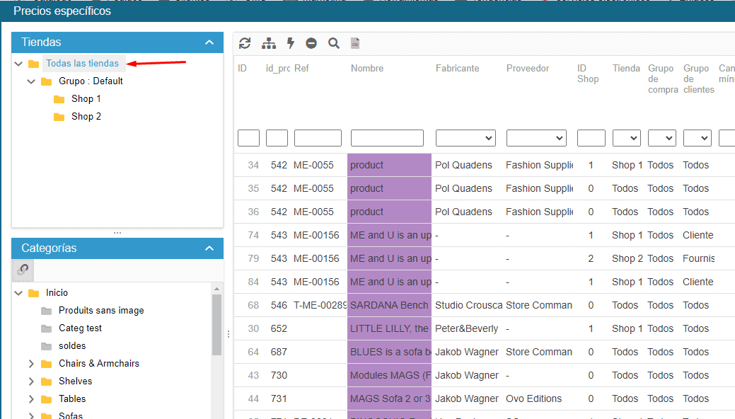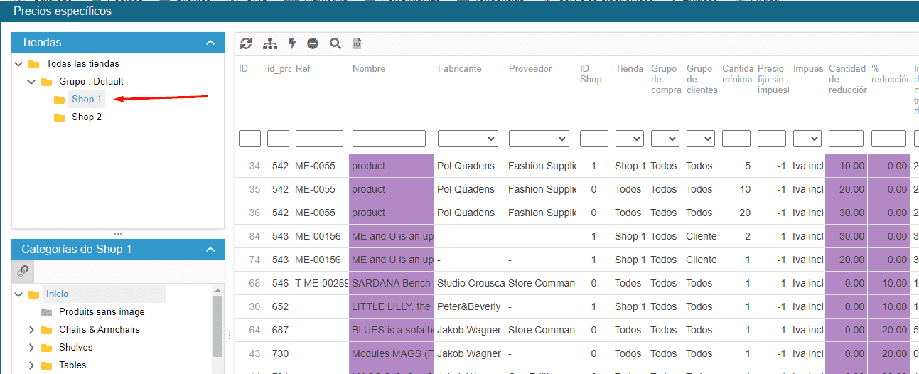 En esta cuadrícula, encontrará una columna "tienda" que le permite decidir en qué tienda aplicar el descuento del producto: una tienda específica o aplicable en todas las tiendas.