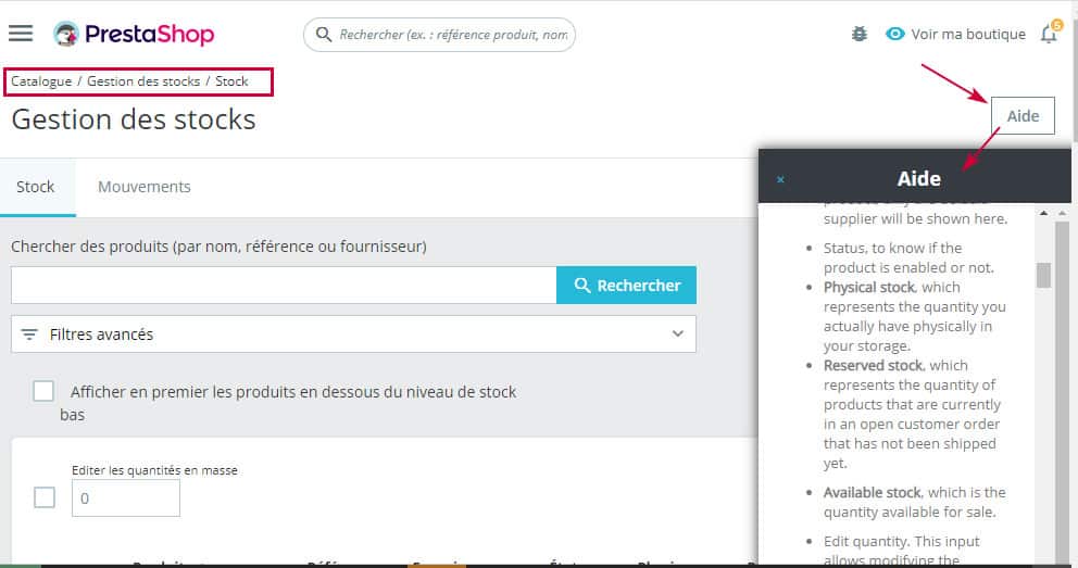 Para saber más sobre la definición de estos campos, despliegue la página Ayuda en su backoffice PrestaShop cuando esté en la página “Gestión de existencias > Existencias”: