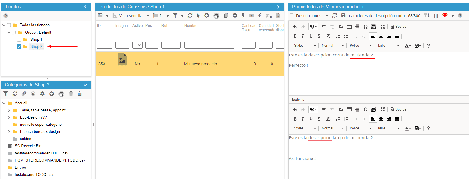 En este segundo ejemplo, para el mismo producto, la descripción que se escriba se aplicará a la tienda 2.