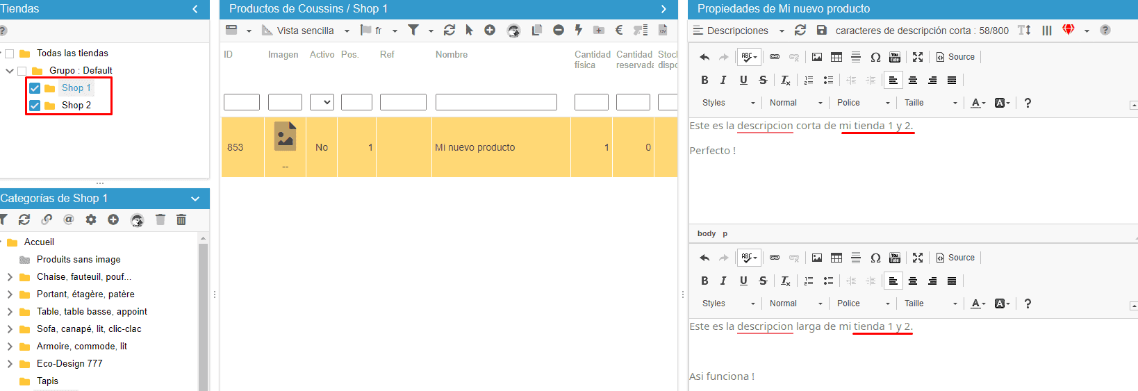 En este caso, cualquier cambio realizado en los productos se aplicará a estas dos tiendas, si los productos en cuestión están presentes en estas dos tiendas, por supuesto.