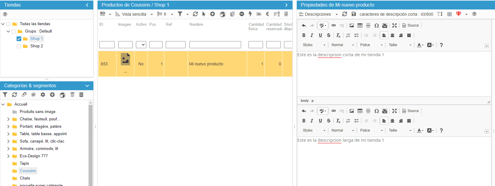 Cuando un producto existe en varias tiendas, tiene la posibilidad de definir una descripción específica en cada tienda, o común a varias tiendas.