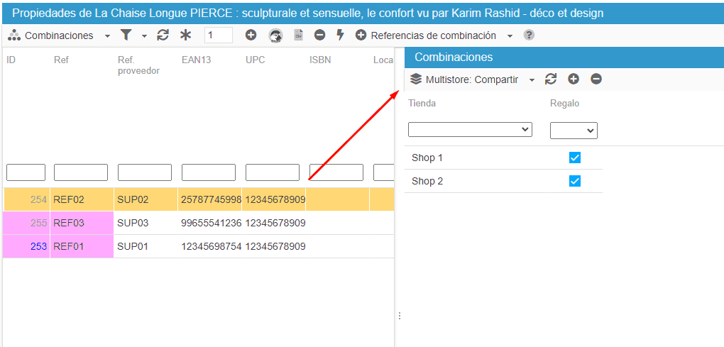 La gestión de las multiboutiques le permite asociar sus declinaciones a boutiques específicas, desde la rejilla Multiboutiques Partage dedicada a las declinaciones.