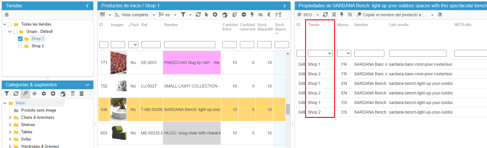 Esta cuadrícula incluye una columna "tienda" que le permite identificar la información de los productos en todas sus tiendas, y en todos los idiomas si su sitio ofrece varios idiomas.