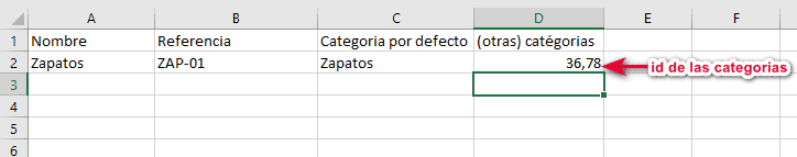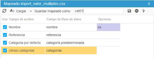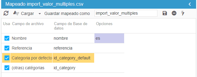Dado que un producto puede encontrarse en varias categorías, y una de ellas será la categoría por defecto (optimización SEO), dos campos están disponibles en la importación: