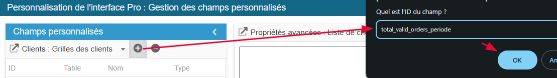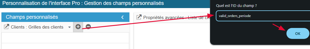 Haga clic en el botón de adición (botón +) para crear la línea del nuevo campo y indique su ID valid_orders_periode