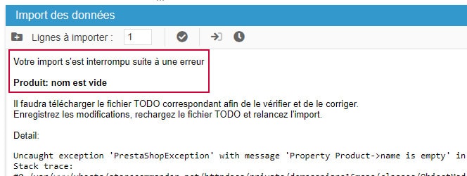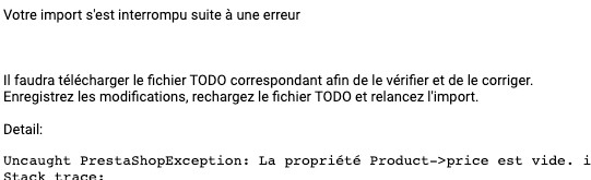 Tenga en cuenta que PrestaShop realiza comprobaciones en muchos campos cuando los productos se modifican durante una importación. Como resultado, el campo en error no está necesariamente incluido en su archivo de importación.