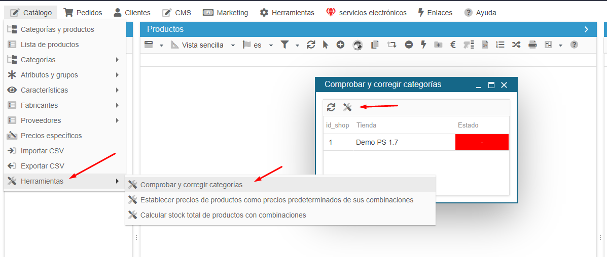 1. En la interfaz de Store Commander > Catálogo > Herramientas > Comprobar y corregir las categorías.
