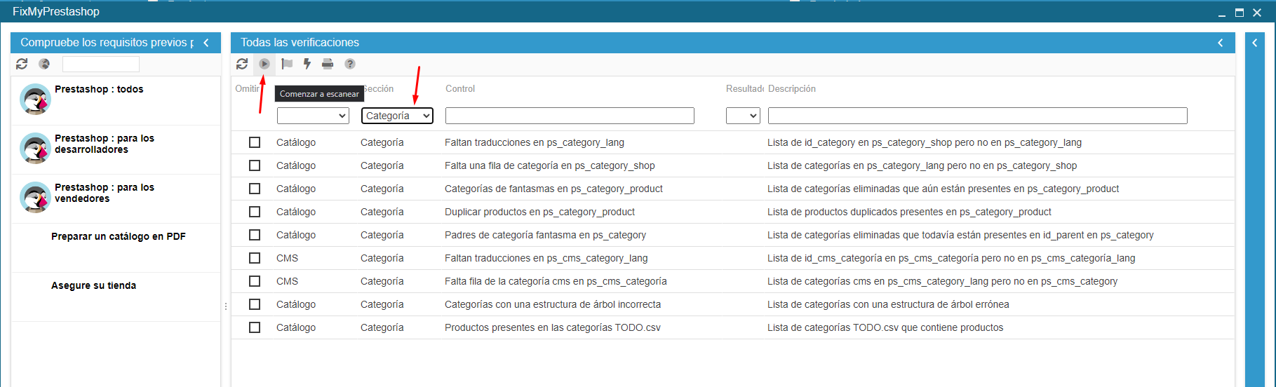 2. Si persiste el error, utilice FixMyPrestaShop que está accesible en el menú Herramientas de su interfaz ScPuede filtrar los controles de categorías si no quiere activar la totalidad de los controles para ir más rápido.El error debería encontrarse y podrá aplicar la corrección propuesta en el panel de la derechaReinicie después la importación.