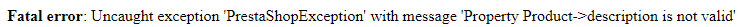 Fatal error: Uncaught exception 'PrestaShopException' with message 'Property Product → link_rewrite is not valid