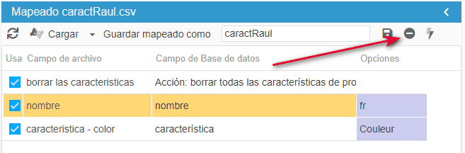 Para eliminar los mapeados de importación, puede cargar el mapeado correspondiente y hacer clic en el icono de eliminación :