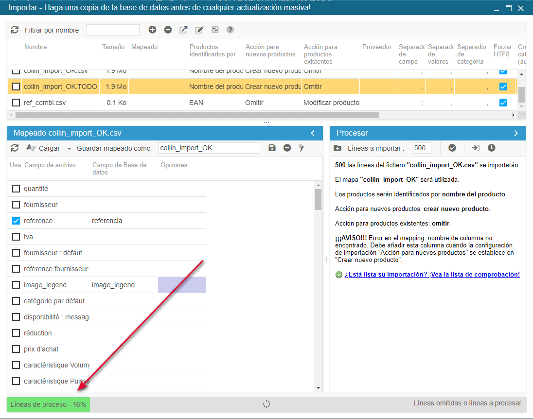 Store Commander utilizará este archivo para importar los datos, línea por línea.Cuando se trta una línea correctamente, se suprime del archivo TODO, y así sucesivamente.