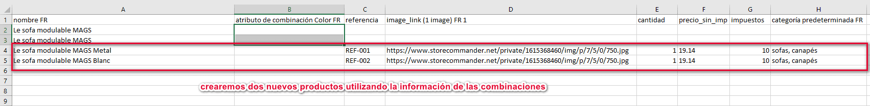 La exportación incluirá los campos de las versiones: atributos, referencias, precios, imágenes y cualquier otra información que desee transmitir a los nuevos productos.También incluimos la categoría por defecto, para que los nuevos productos creados se encuentren en esta misma categoría.Este es el mapping para el ejemplo de la camiseta en 3 colores: