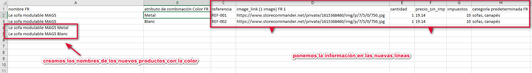 En la columna NOMBRE, creamos el nombre de los 3 nuevos productos (nombre + atributos) y arrastramos los otros datos a las líneas de los nuevos nombres:
