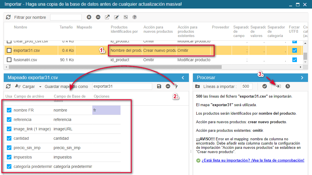 Tenga presente que en la exportación puede incluir otros campos que desee transmitir a los nuevos productos, como fabricante, proveedor, SEO, etc.