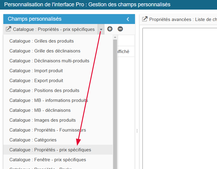 Assurez-vous de bien choisir la grille dans laquelle vous voulez ajouter votre champ - dans cet exemple, il s’agira de ‘Catalogue : Propriétés - prix spécifiques’ :