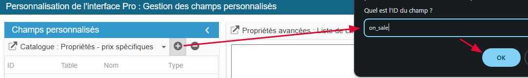 Clic sur l’icône d’ajout pour créer la ligne du nouveau champ et indiquez son ID on_sale