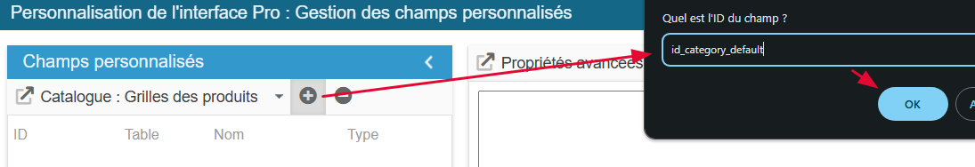 Clic sur l’icône d’ajout pour créer la ligne du nouveau champ et indiquez son ID id_category_default