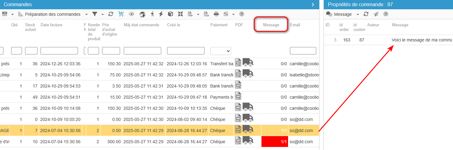 La gestion des commandes dans Store Commander vous permet d'identifier rapidement si des messages sont associés aux commandes de vos clients.