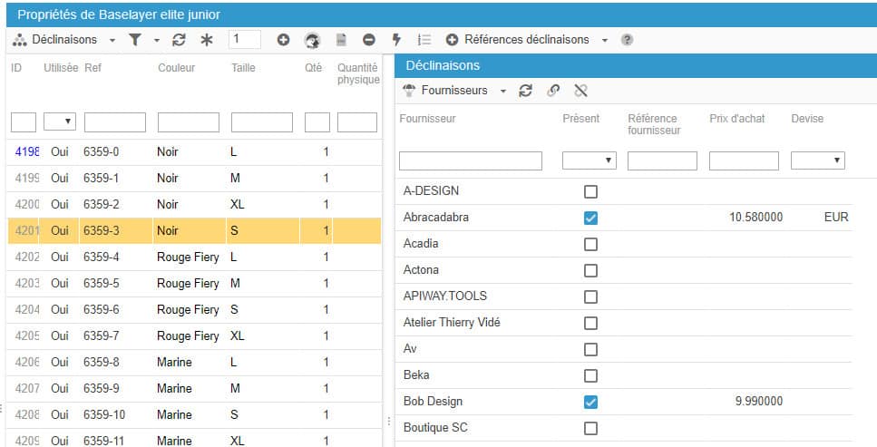 Vous pouvez associer les fournisseurs à vos déclinaisons en suivant la même procédure, à l'exception de l'identifiant utilisé qui doit impérativement être celui des déclinaisons (id_product_attribute, référence, etc).