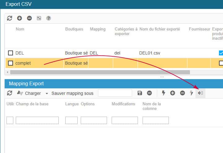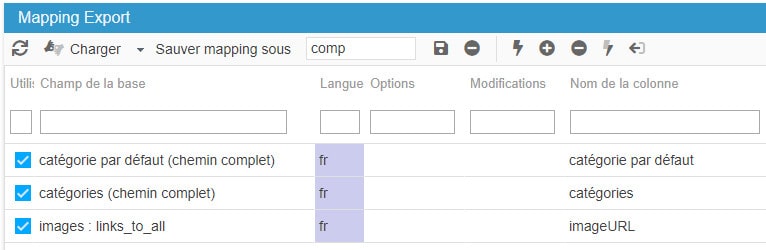 De retour dans le panneau supérieur, sélectionnez le nom du mapping, de la sélection de catégories, saisissez le nom du fichier d'export et cochez les options requises comme sur la capture ci-dessous.