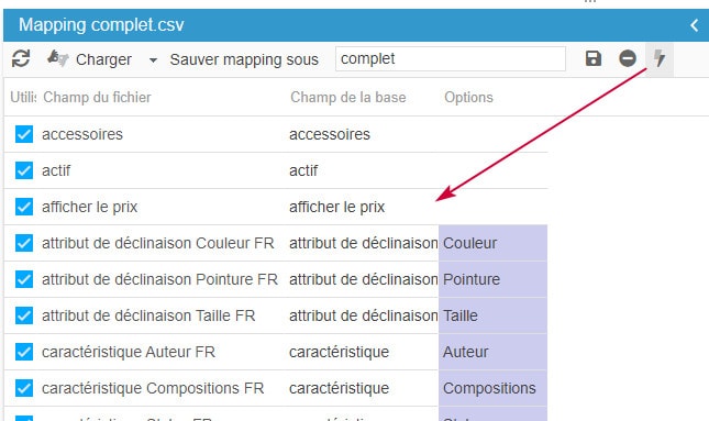 Aucun besoin de sélectionner les champs de la base un par un, mais cliquez sur l'icône 'Charger les champs par leur nom'. Les champs du mapping sont remplis automatiquement.