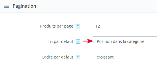 La toute première vérification à effectuer est l'option de pagination dans votre backoffice PrestaShop > Paramètres de la boutique > Produits > Pagination. Pour pouvoir utiliser les positions des produits, il faut que l'option 'Tri par défaut' soit définie sur 'Position dans la catégorie'