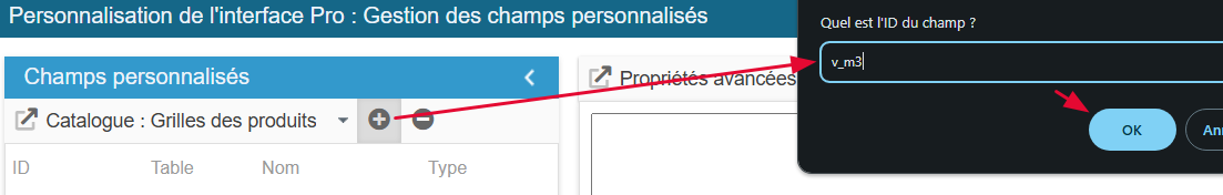 Clic sur l’icône d’ajout pour créer la ligne du nouveau champ et indiquez son ID v_m3