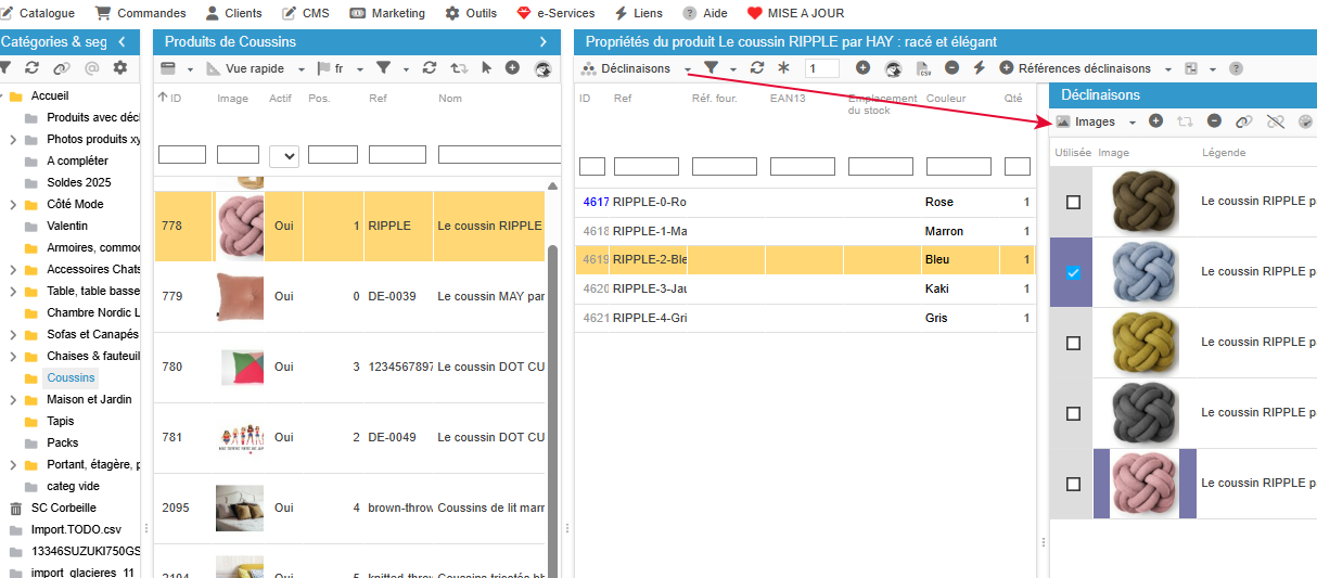 Sélectionnez d’abord les déclinaisons concernées, (toutes les rouges par exemple), et ensuite glissez les images correspondantes que vous souhaitez associer dans le panneau des images.