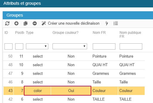 Sélectionnez Type = color et Groupe Couleur = Oui