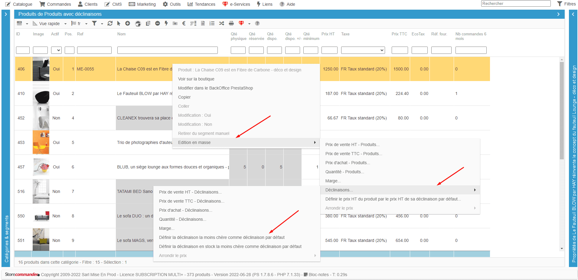 Cette grille permet d’afficher les déclinaisons de plusieurs produits, que vous sélectionnez au préalable. Et bien sûr, vous pouvez appliquer des modifications en masse, comme un copier/coller de prix, la mise en place d’une promotion, l’association d’images, etc, et tout cela en masse bien sûr avec la multi-sélection !