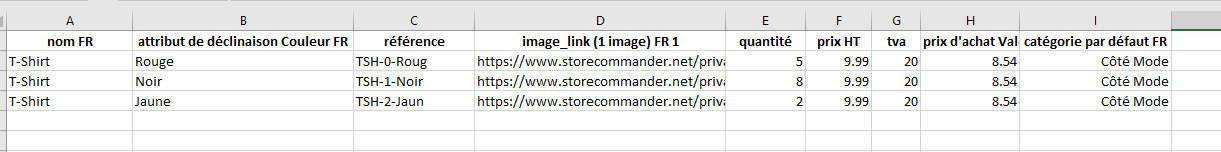 L'export contiendra les champs des déclinaisons : attributs, références, prix, images et toutes autres informations que vous souhaitez répercutées sur les nouveaux produits.Nous incluons aussi la catégorie par défaut, pour que les nouveaux produits créés se trouvent dans cette même catégories.Voici le mapping pour l'exemple de t-shirt en 3 couleurs :