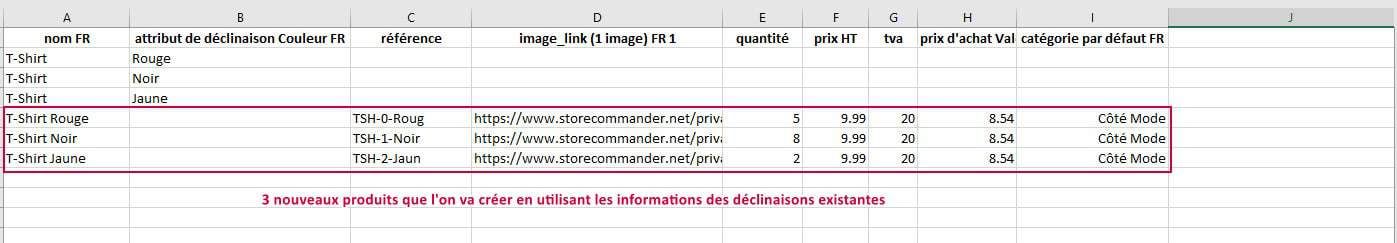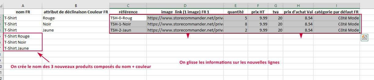 Dans la colonne NOM, nous créons le nom des 3 nouveaux produits (nom + attributs) et glissons les autres données sur les lignes des nouveaux noms :