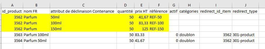 2. Pour les deux autres produits : parfum 100ml et parfum 150ml : on ajoute les colonnes et valeurs suivantes :