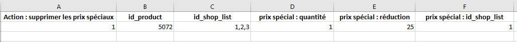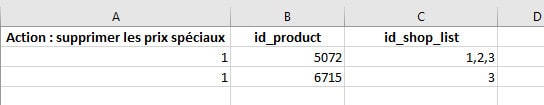 A l'import, pour supprimer les prix spéciaux d'un produit dans des boutiques spécifiques, vous pouvez indiquer les id boutiques dans le champ 'id_shop_list'.Dans cet exemple, nous supprimons tous les prix spéciaux du produit ID 5072 dans les boutiques id 1, 2 et 3, et sur le produit ID 6715 uniquement dans la boutique ID 3