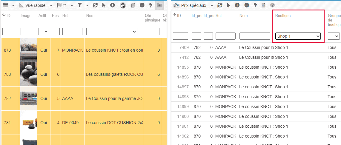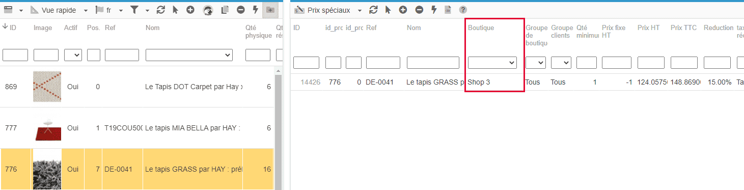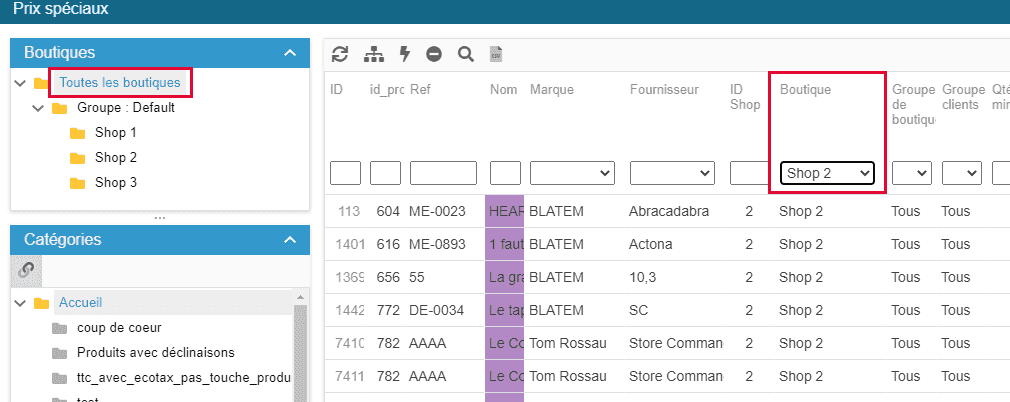 Dans cette grille, vous trouverez une colonne 'boutique' qui vous permet de décider sur quelle boutique appliquer la remise du produit : une boutique spécifique ou applicable sur toutes les boutiques.