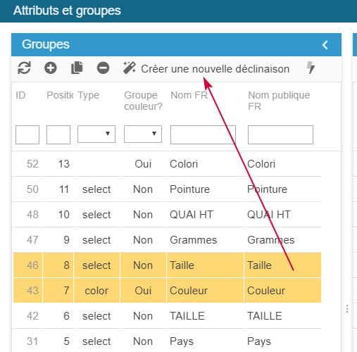 Dans cet exemple, nous avons choisi Couleur et Taille. Une fois les groupes sélectionnés, cliquez sur « Créer une nouvelle déclinaison » dans la barre d'outils.